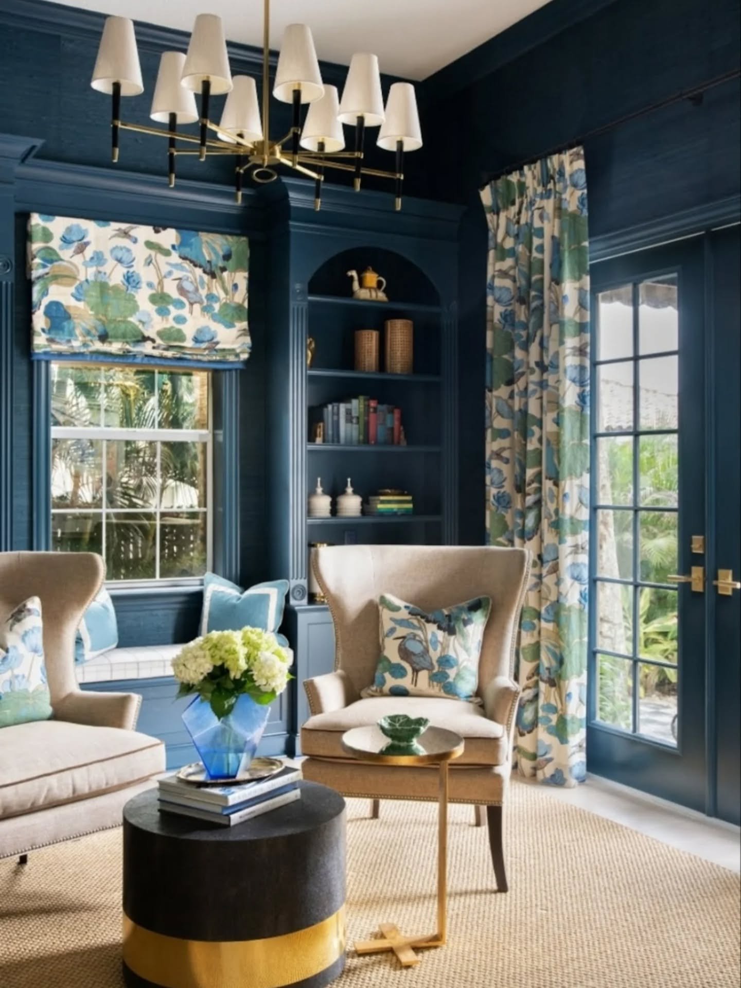 View fullsize Moody interiors are having a major moment for 2026—and we’re here for it. This stunning home library is wrapped in a rich navy that creates depth, coziness, and a touch of drama. We layered in fresh greens and cream through art and decor