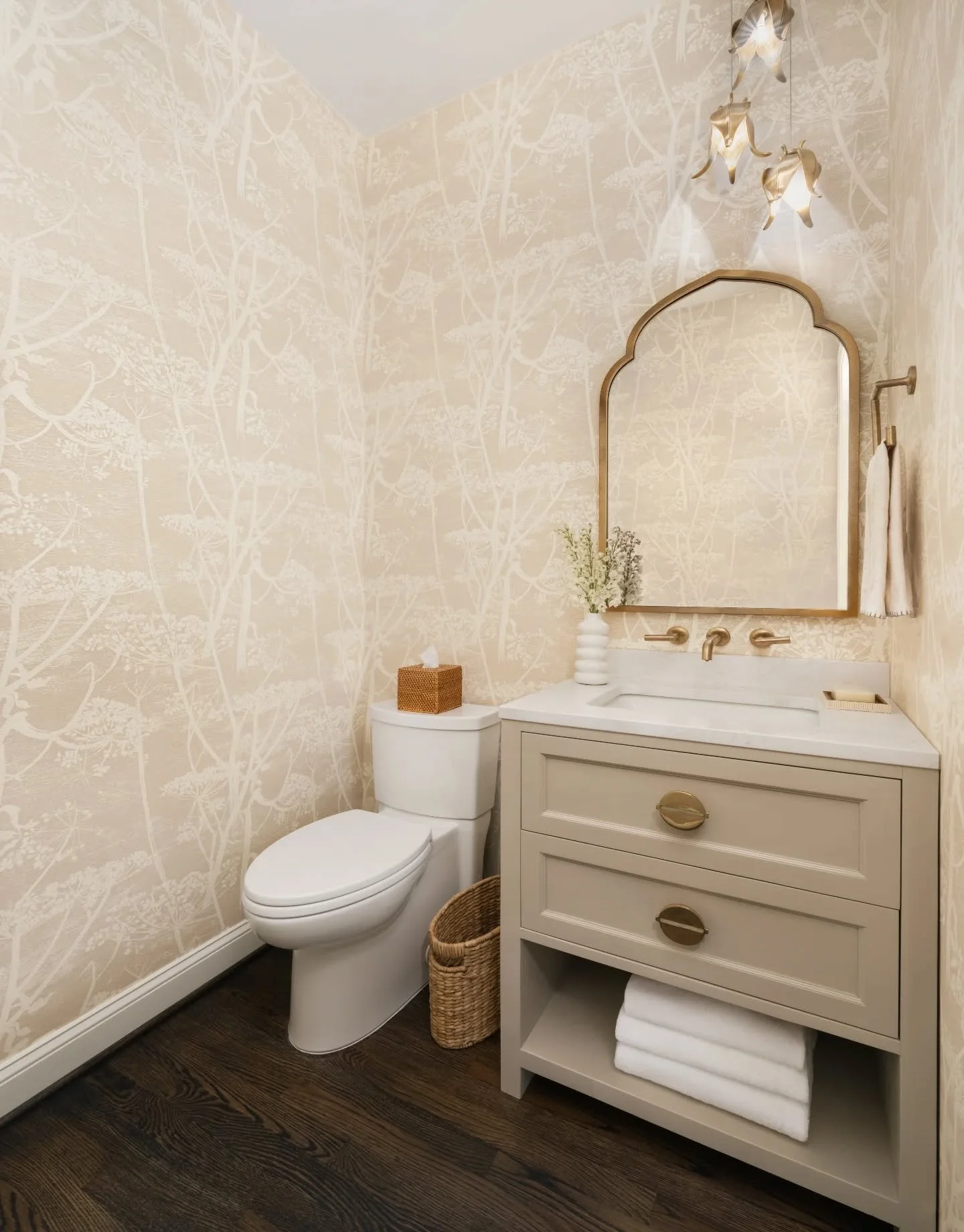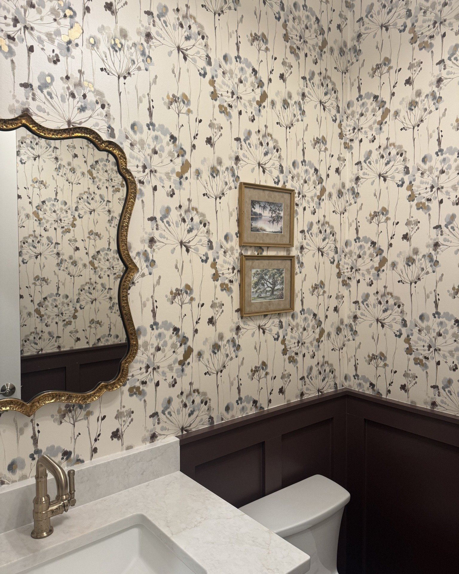 View fullsize A sweet powder room layered with all the pretty details ✨ The lotus pendant lights hang so delicately, adding a soft glow, the pattern in the mirror add a touch of whimsy, while the wallpaper brings in a sense of quiet luxury with a feminine touch. P