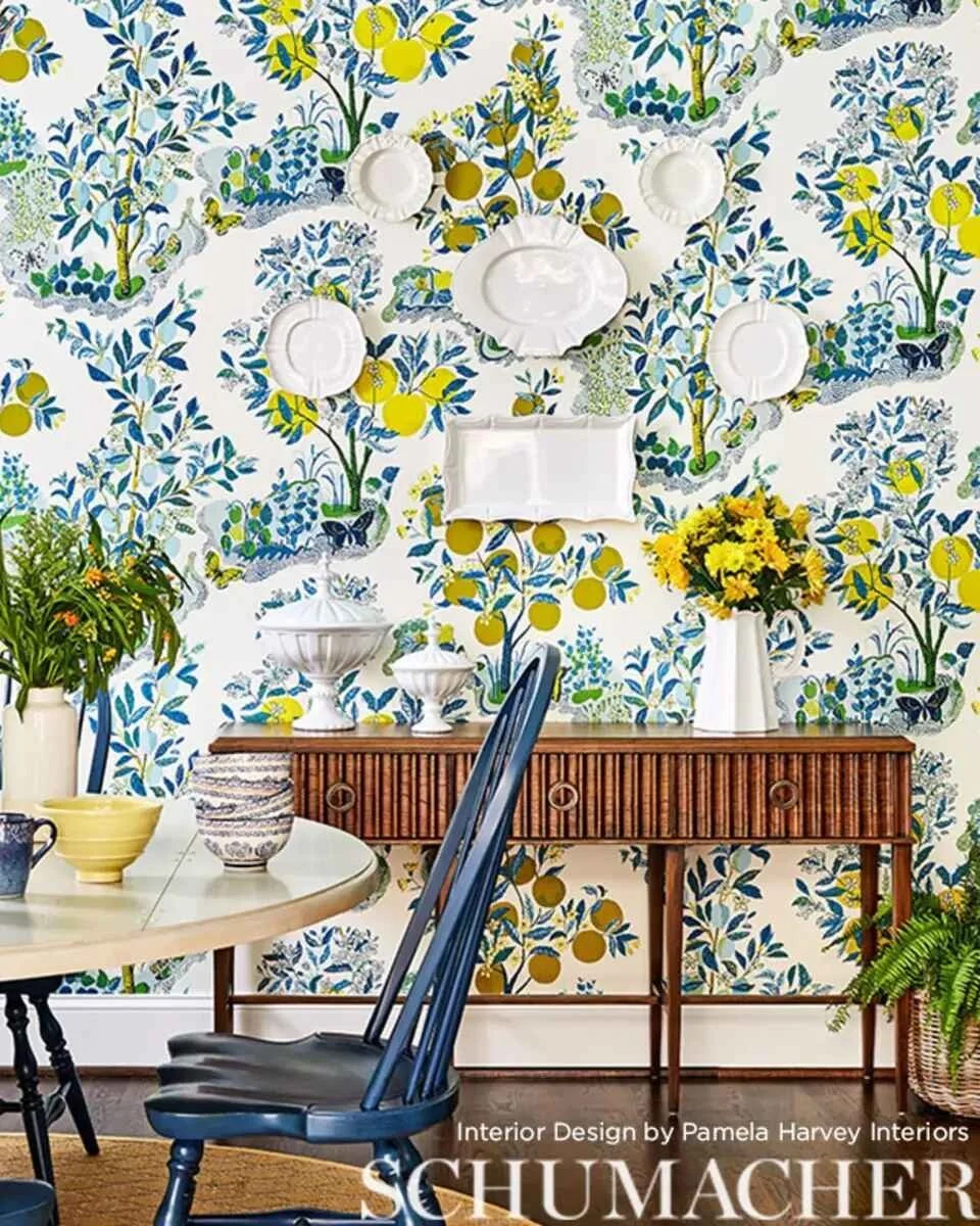 Grateful to @schumacher_uk for featuring our Northern Virginia studio's breakfast room layered with their Citrus Garden wallcove