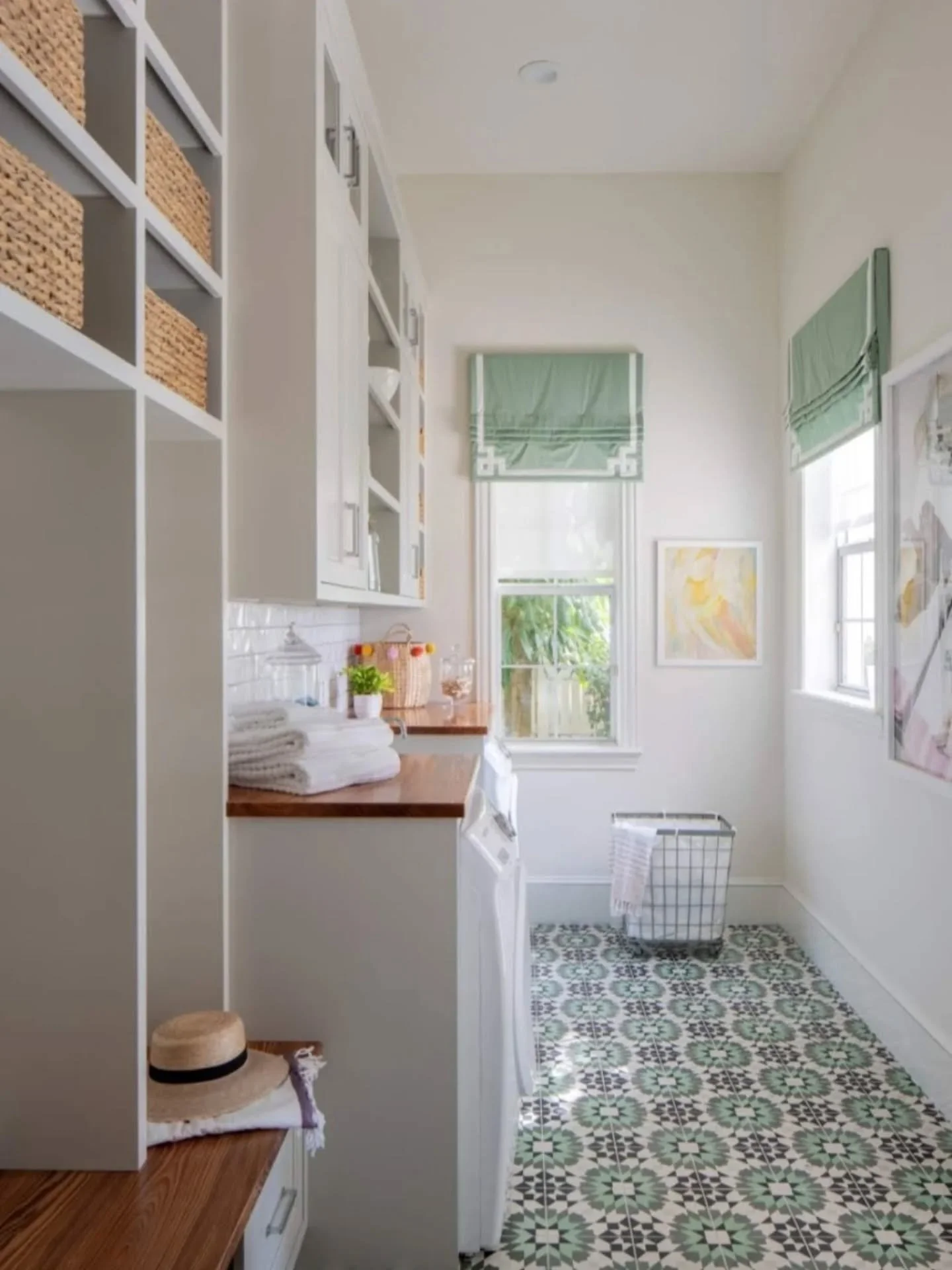 This laundry room was designed to feel calm and effortless, even on the most adult of Sundays. The star-patterned tile adds just enough personality, while soft light greens and a neutral palette keep t