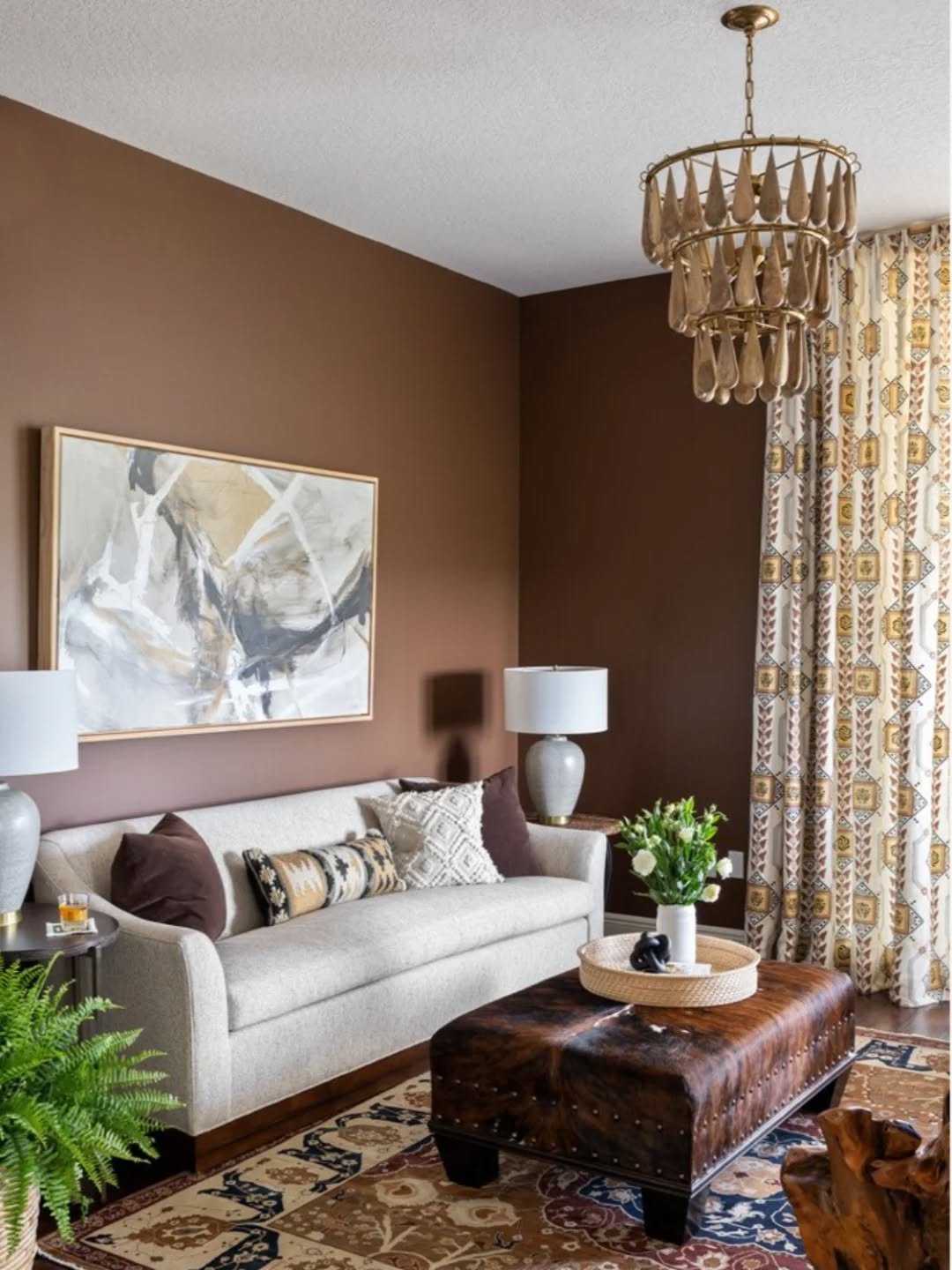 A rich, chocolate leather–toned paint instantly warms the room, setting the tone for a sitting space made for lingering. On a cold day, this is exactly where we want to be—unhurried, comfortable, and reconnected
